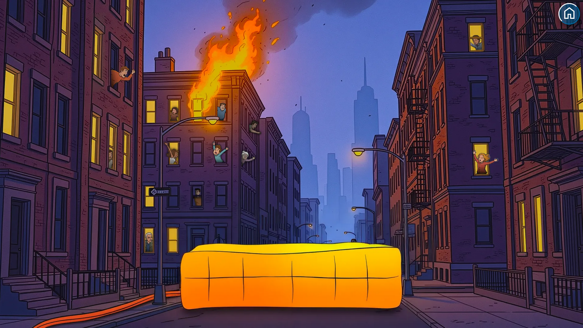 Auf dem Weg müssen Menschen aus einem brennenden Haus gerettet werden. Hierzu wird mit einer Luftpumpe, die vor dem Terminal steht, ein Kissen aufgeblasen.