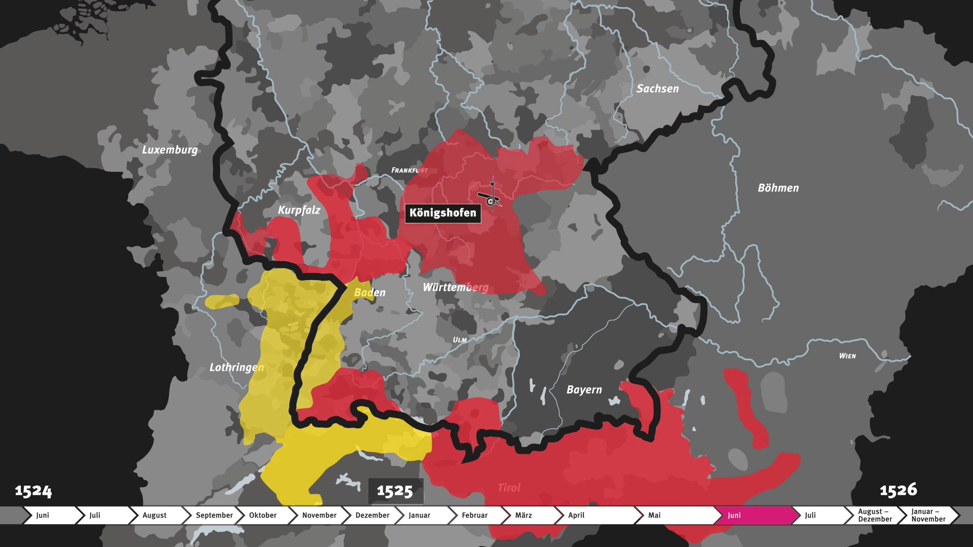 In der Animation werden die Ausbreitung der Aufstände und die wichtigsten Ereignisse dargestellt. Auf der Zeitleiste sind die zeitlichen Zusammenhänge zu sehen.